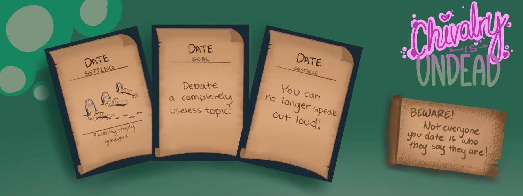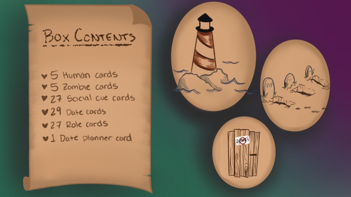 In this mixed improv and social deduction game, you will roleplay as zombies going on dates! One player will be the dedicated date planner who sets the scene for each date using a given date setting and date goal. Players then improvise the date and get to know one another! Among the players there will be multiple humans pretending to be zombies, use given social cues to figure out who they are.